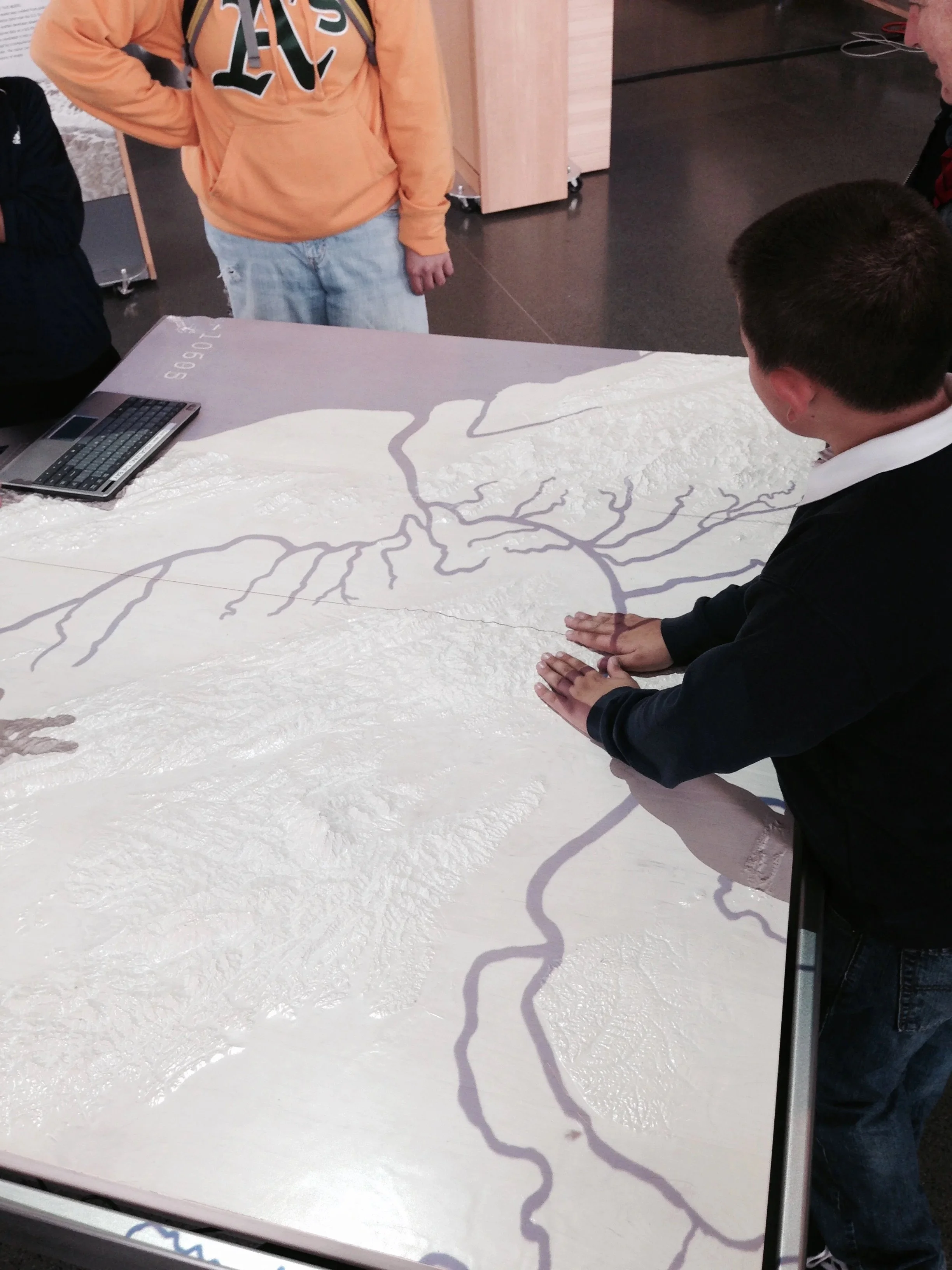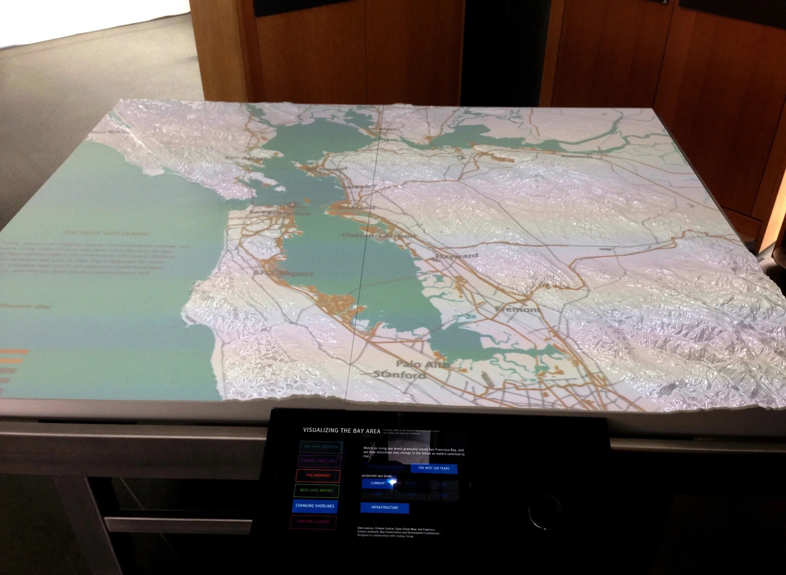 In 2015, I had the opportunity to be a Scientist-in-Residence in the Bay Observatory and create an interactive visualization, Changing Shorelines, about Bay Area sea level rise projected on a 3D relief map table (currently on view).