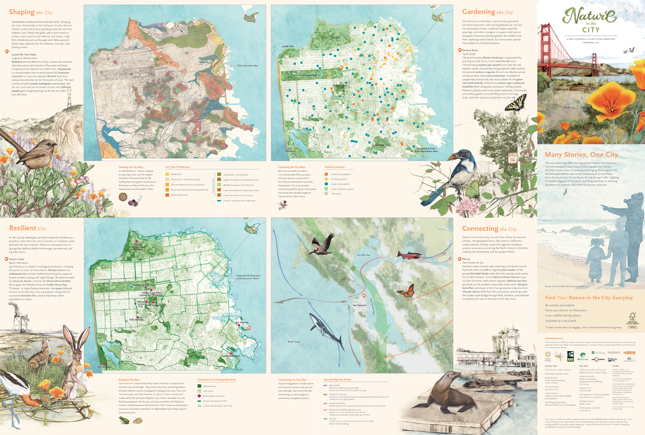 Impact: 50,000 copies of the map were distributed by Nature in the City through their website and environmental stewardship programs. The creative team and advisors were invited to speak at various events (SFMOMA, David Rumsey Map Center, Standford). The map was published in the Atlas of Design (Vol 5) of the North American Cartographic Information Society, 2020.